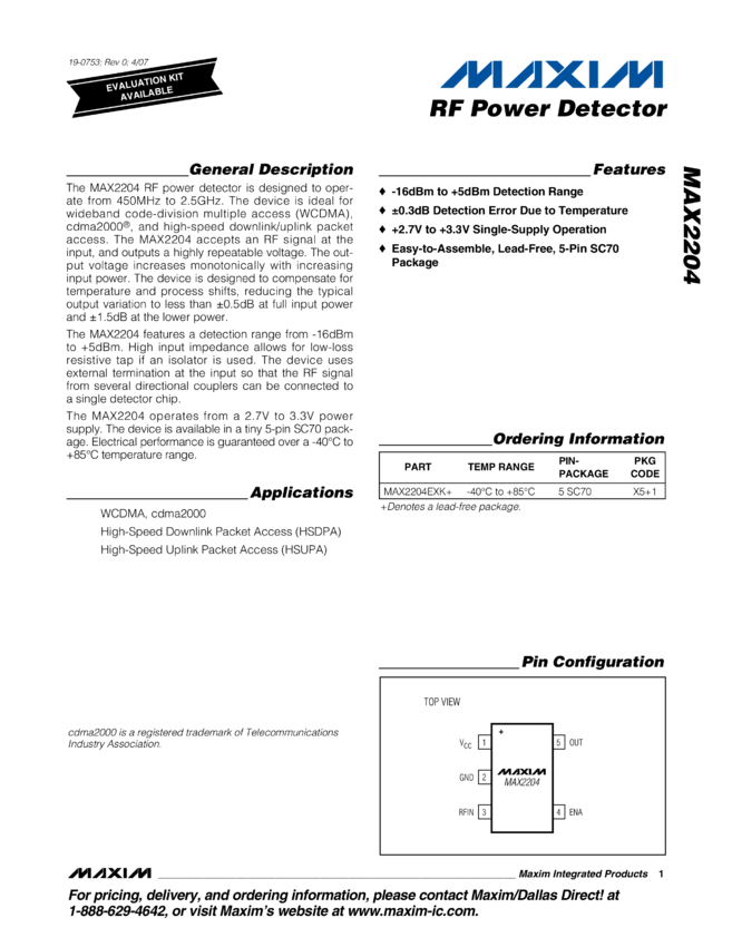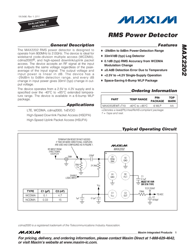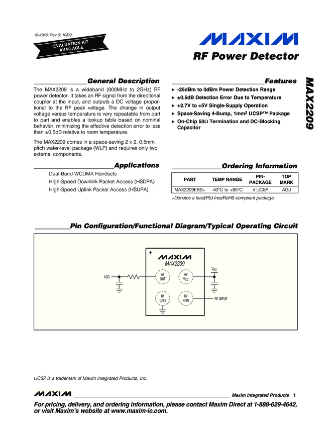MAX2205, MAX2206, MAX2207, MAX2208 RF Power Detectors in UCSP