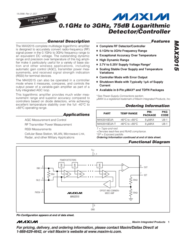 MAX2015 0.1GHz to 3GHz, 75dB Logarithmic Detector/Controller