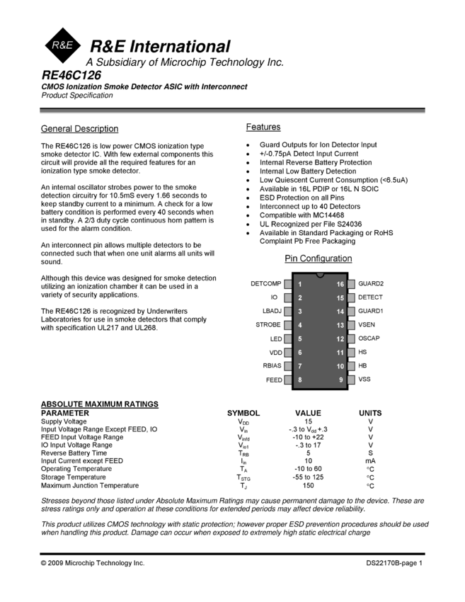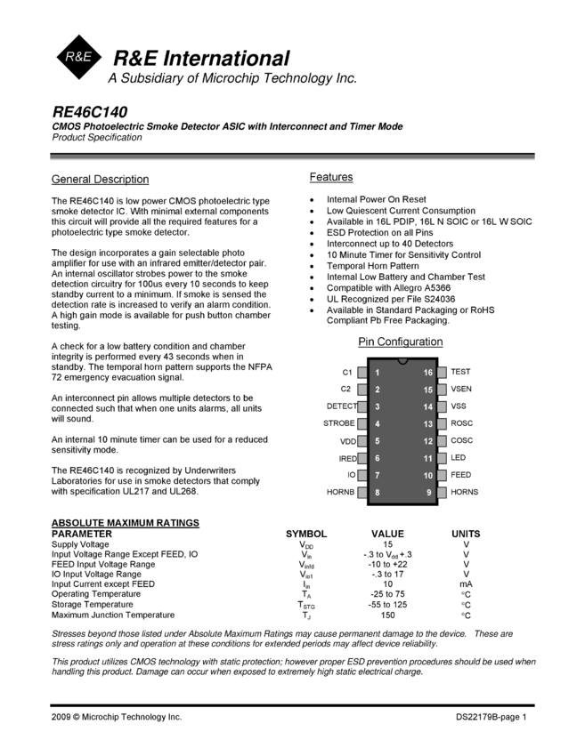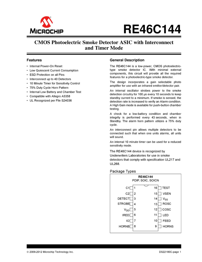 RE46C144 - CMOS Photoelectric Smoke Detector ASIC w/ Interconnect and Timer Mode (06/15/2012)
