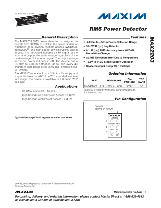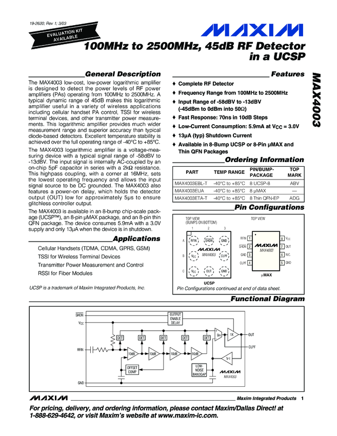 MAX4003 100MHz to 2500MHz, 45dB RF Detector in a UCSP