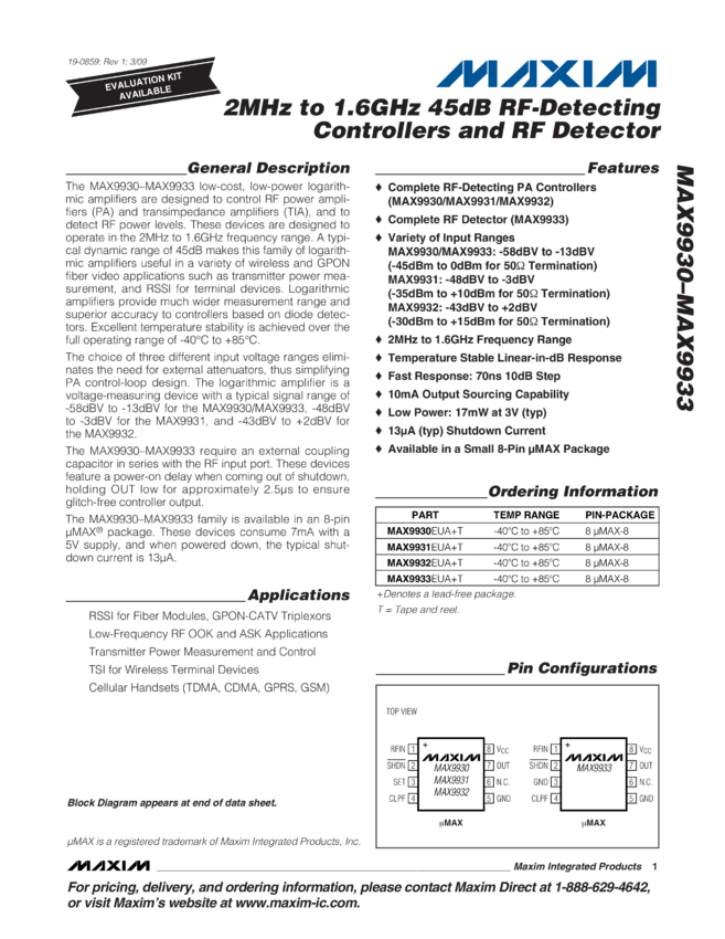 MAX9930, MAX9931, MAX9932, MAX9933 2MHz to 1.6GHz 45dB RF-Detecting Controllers and RF Detector
