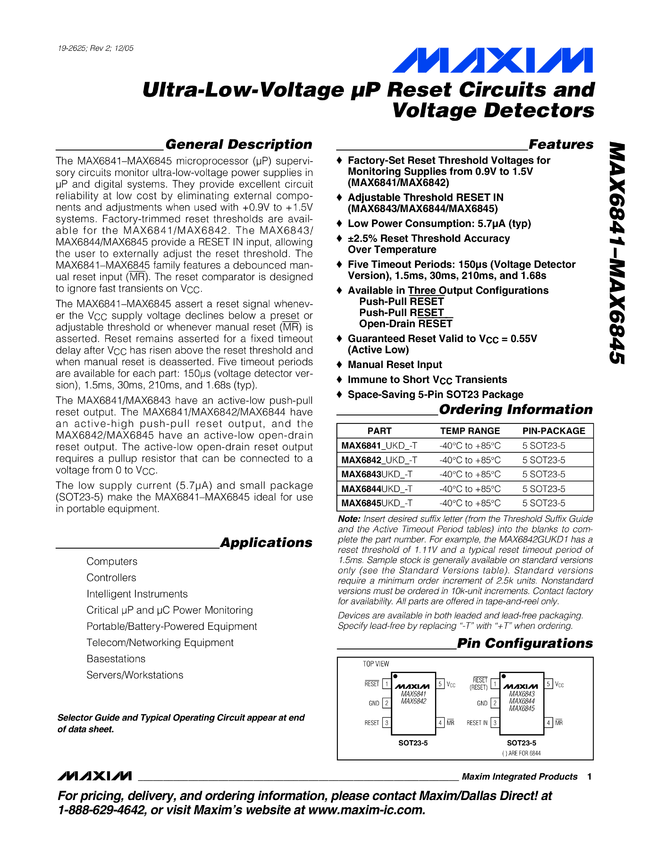 MAX6841, MAX6842, MAX6843, MAX6844, MAX6845 Ultra-Low-Voltage µP Reset Circuits and Voltage Detectors