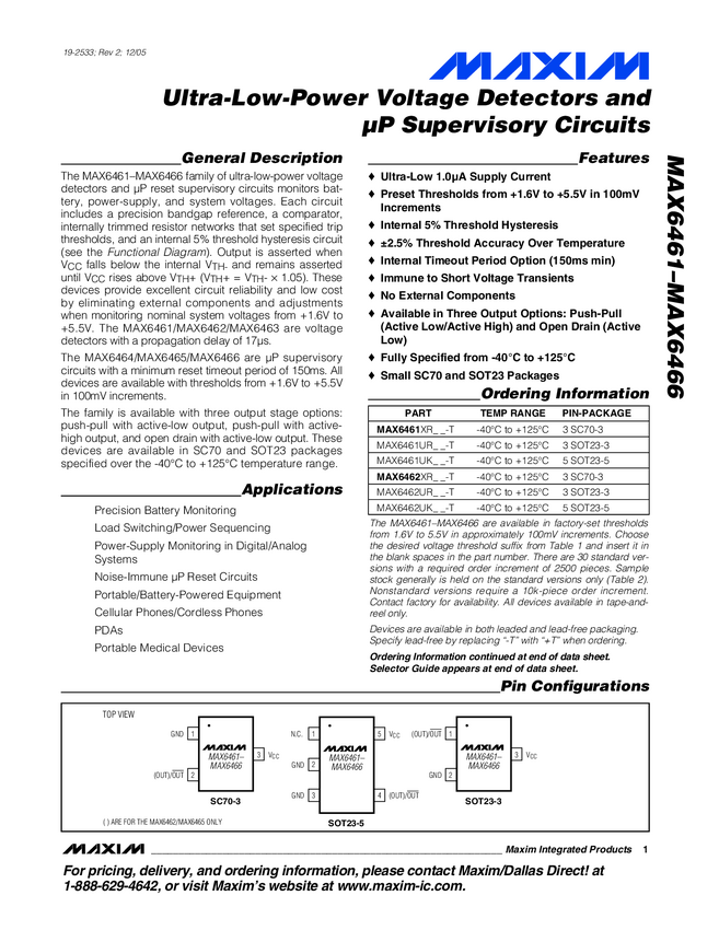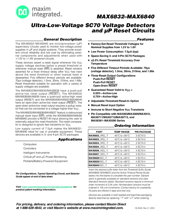 MAX6832, MAX6833, MAX6834, MAX6835, MAX6836, MAX6837, MAX6838, MAX6839, MAX6840 Ultra-Low-Voltage SC70 Voltage Detectors and µP Reset Circuits