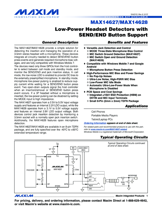 MAX14627, MAX14628 Low-Power Headset Detectors with SEND/END Button Support