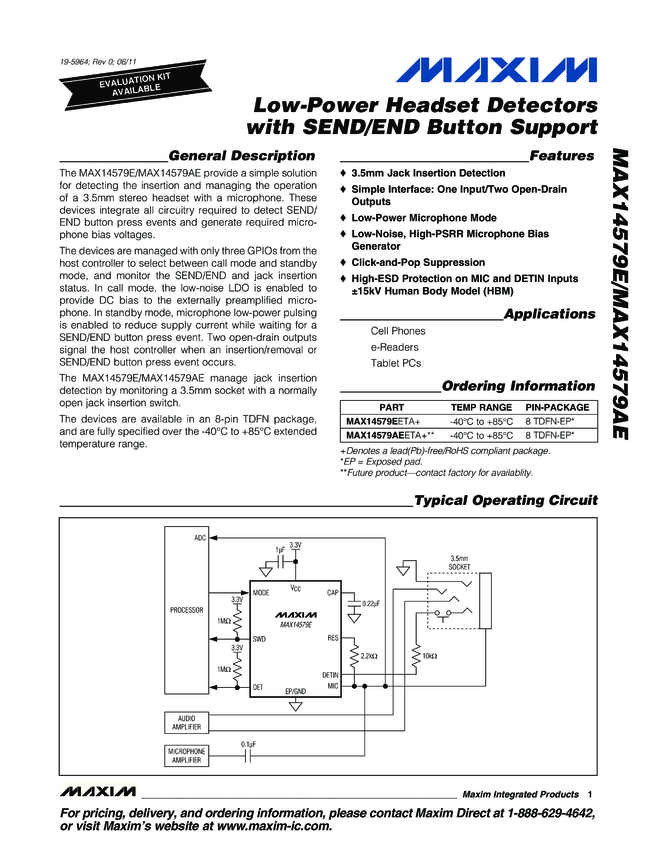 MAX14579AE, MAX14579E Low-Power Headset Detectors with SEND/END Button Support