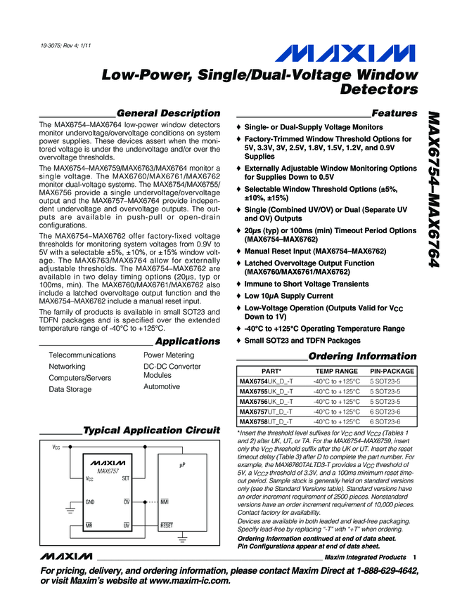 MAX6754, MAX6755, MAX6756, MAX6757, MAX6758, MAX6759, MAX6760, MAX6761, MAX6762, MAX6763, MAX6764 Low-Power, Single/Dual-Voltage Window Detectors