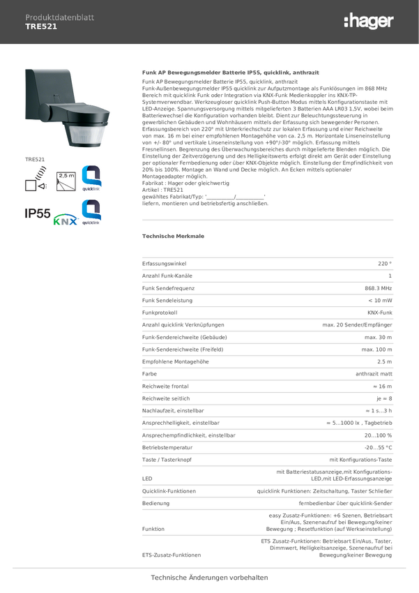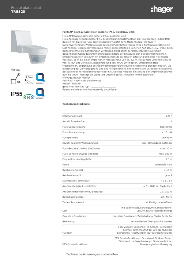 Detektor ruchu Hager TRE520 Zasięg maksymalny 16 m TRE520