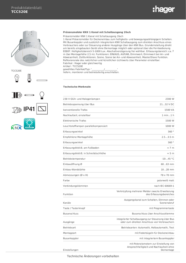 Detektor obecności Hager TCC520E Zasięg maksymalny 7 m
