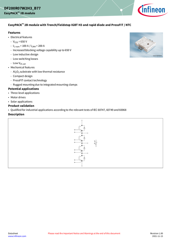 650 V, 200 A 3-level IGBT module EasyPACK™ 2B 650 V, 200 A 3-level IGBT module with Trench/Fieldstop IGBT H3 and rapid diode and PressFIT / NTC.