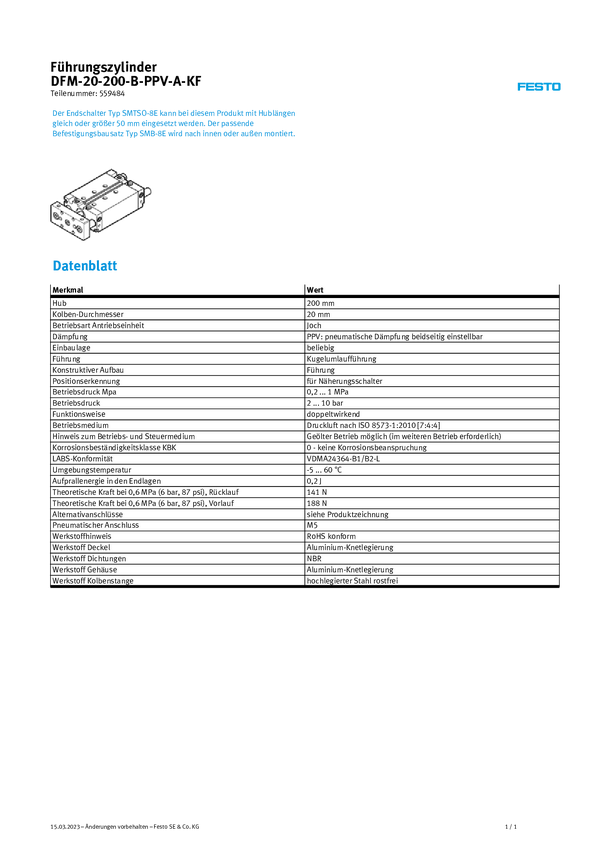 FESTO Siłownik prowadzący 559484 DFM-20-200-B-PPV-A-KF Materiał obudowy: kute aluminium 1 szt.
