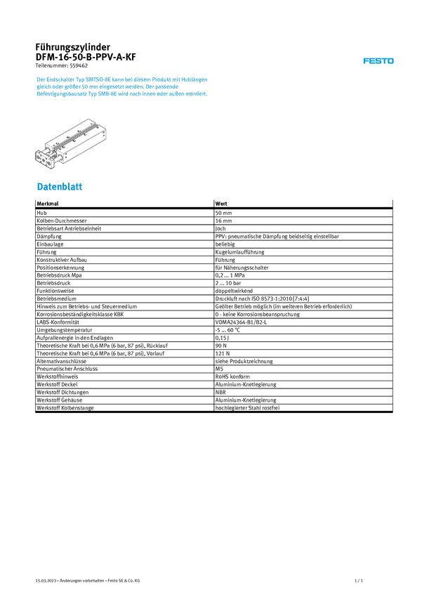FESTO Siłownik prowadzący 559462 DFM-16-50-B-PPV-A-KF Materiał obudowy: kute aluminium 1 szt.