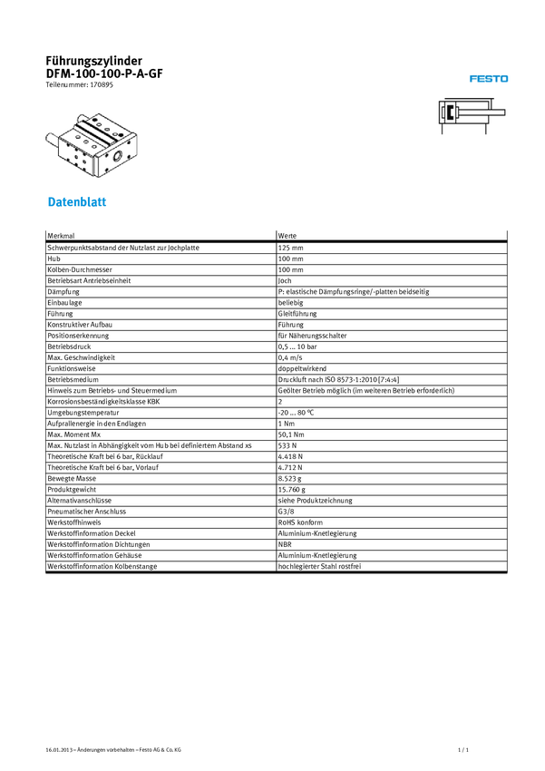 FESTO Siłownik prowadzący 170895 DFM-100-100-P-A-GF Materiał obudowy: kute aluminium 1 szt.