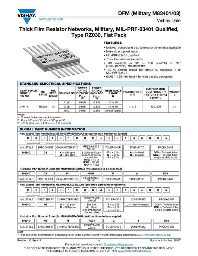 Thick Film Resistor Networks, Military, MIL-PRF-83401 Qualified, Type RZ030, Flat Pack