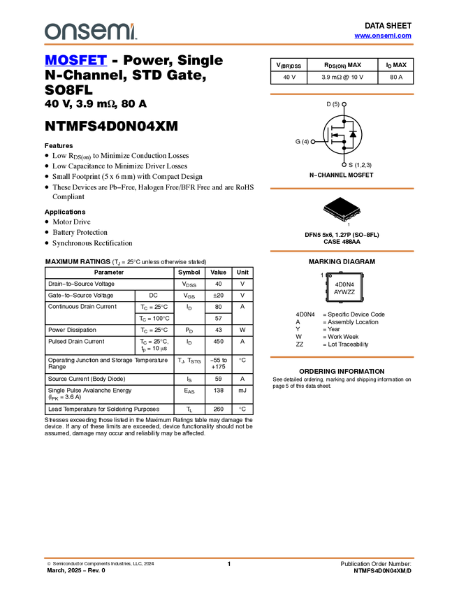 Power, Single N-Channel, T10M, DFN5, STD Gate, SO-8FL 40 V, 4.0 mΩ, 77 A