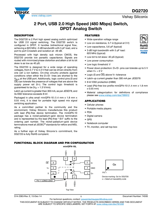 2 Port, USB 2.0 High Speed (480 Mbps) Switch, DPDT Analog Switch