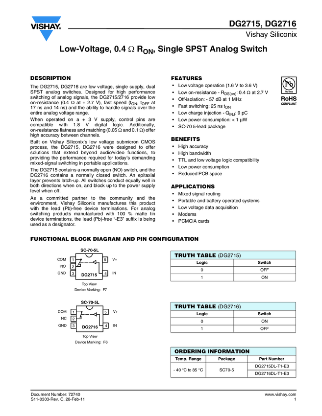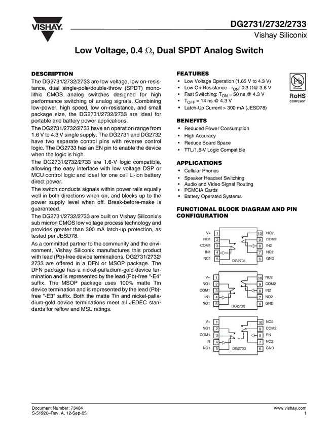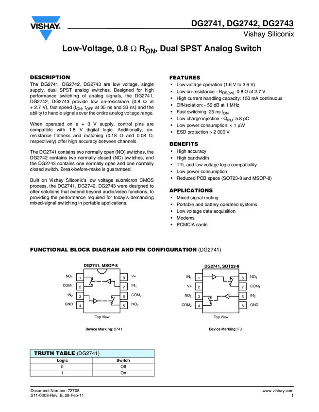 Low Voltage, Low On-Resistance, Dual SPDT Analog Switch