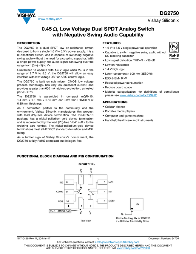 0.45 Ω, Low Voltage Dual SPDT Analog Switch with Negative Swing Audio Capability