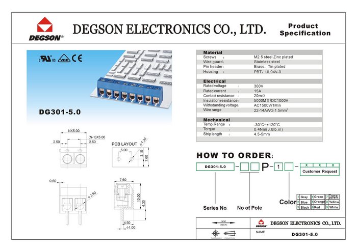 Degson DG301-5.0-02P-12-00AH Zaciski śrubowe 1.50 mm² Ilość styków 2 niebieski 1 szt.