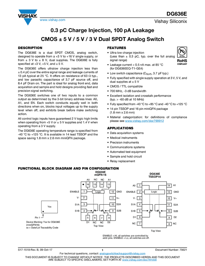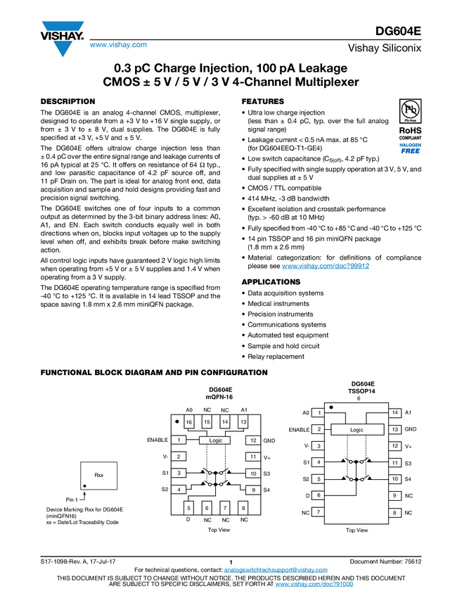 1.4 pC Charge Injection, 100 pA Leakage, Quad SPST Switches