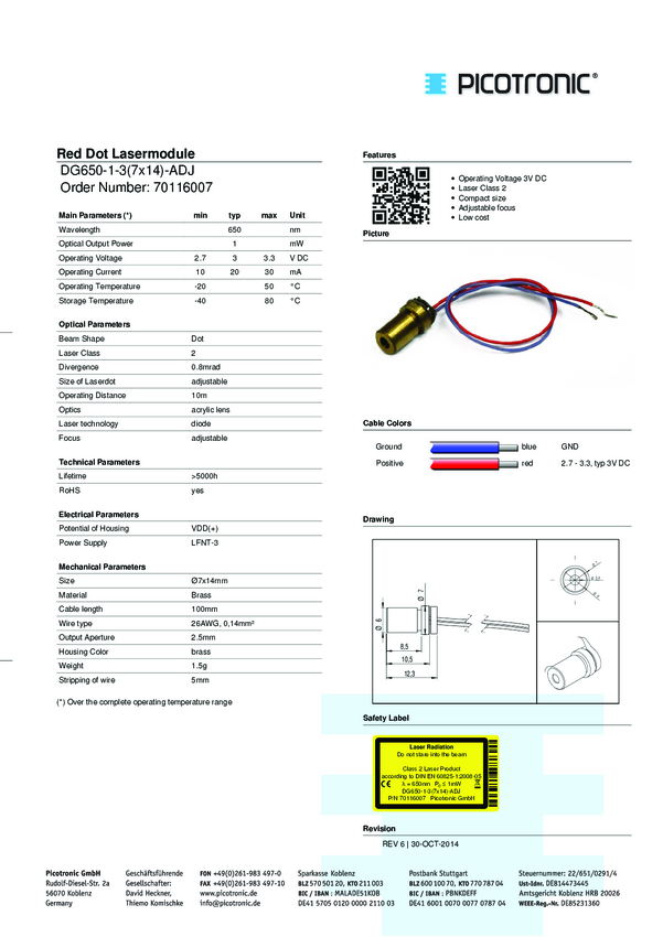 Picotronic 70116007 Moduł laserowy DG650-1-3(7x14)-ADJ, klasa 2, 1 mW, 650 nm