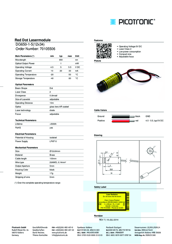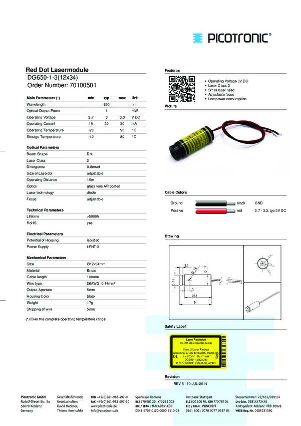 Picotronic 70105506 Moduł laserowy DG650-1-5(12x34), klasa 2, 1 mW, 650 nm