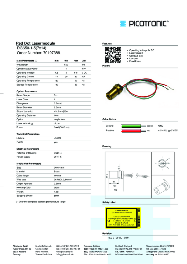 Picotronic 70107388 Moduł laserowy DG650-1-5(7x14), klasa 2, 1 mW, 650 nm