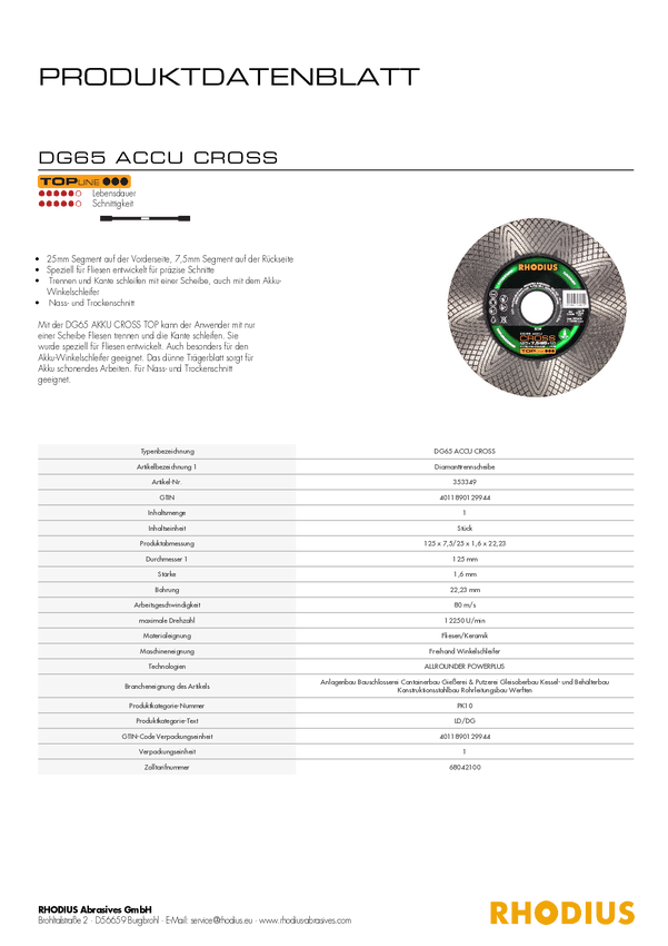 Tarcza tnąca diamentowa Rhodius DG65 ACCU CROSS 353349 1 szt.