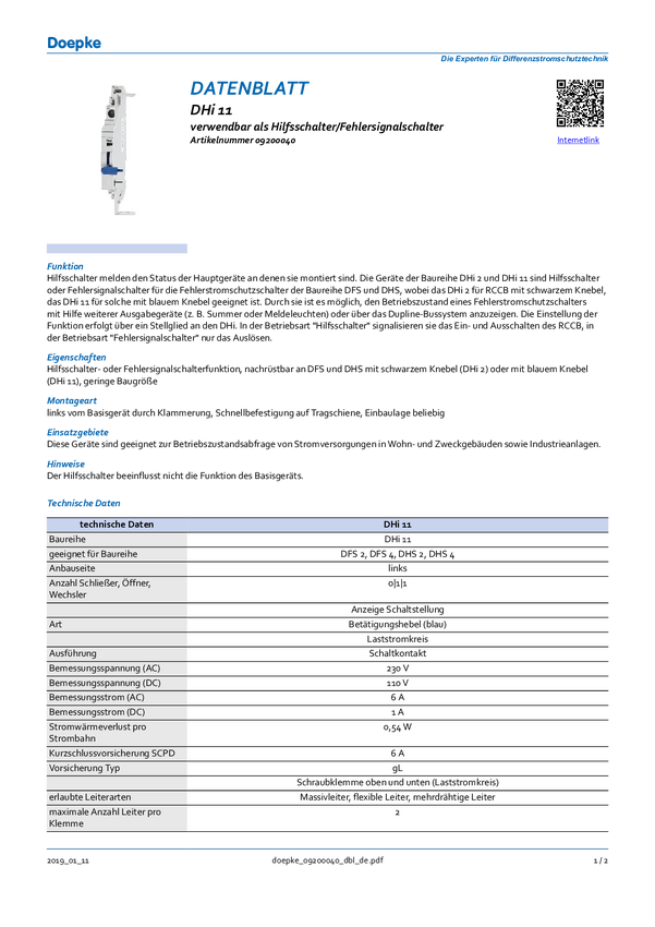 Doepke DHi 11/DFS2/4 Przełącznik pomocniczy 1 NC, 1 zestyk przełączny 230 V 1 szt.