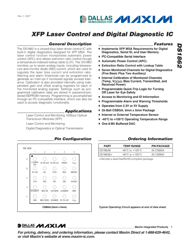 DS1862 XFP Laser Control and Digital Diagnostic IC