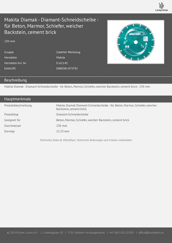 Tarcza tnąca diamentowa Makita D-61145 230 mm 1 szt.
