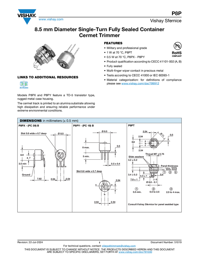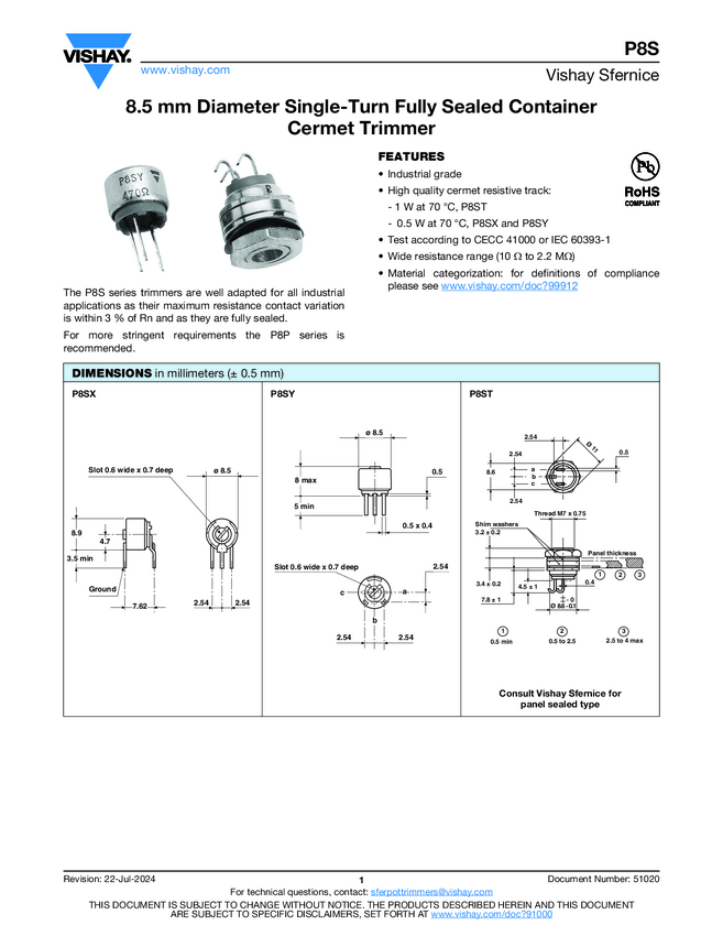 8.5 mm Diameter Single-Turn Fully Sealed Container Cermet Trimmer