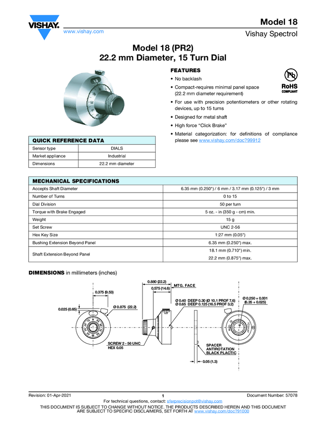 Model 18 (PR2) 22.2 mm Diameter, 15 Turn Dial