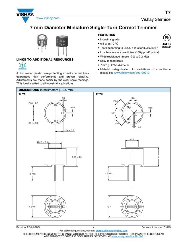 7 mm Diameter Miniature Single-Turn Cermet Trimmer