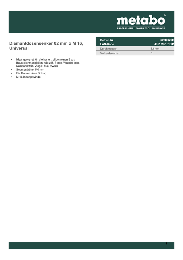 Wiertło diamentowe do wiercenia na sucho Metabo 628096000 1 szt.