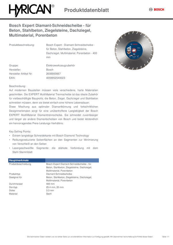 Bosch Accessories 2608900667 EXPERT MultiMaterial Tarcza tnąca diamentowa Średnica 400 mm Średnica otworu 20 mm, 25.40 m