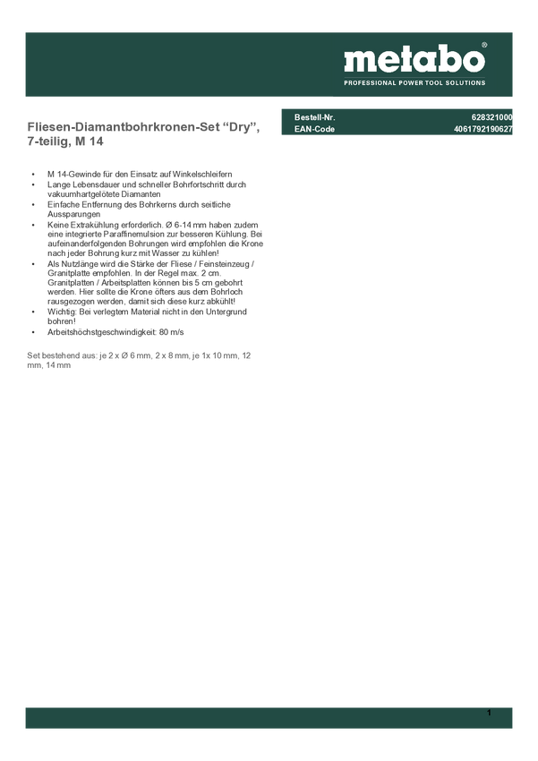 Komplet wierteł diamentowych do wiercenia na sucho Metabo Dry 628321000 1 szt.
