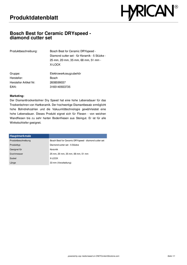 Komplet wierteł diamentowych do wiercenia na sucho Bosch Accessories Bosch Power Tools 2608599037 33 mm 1 szt.