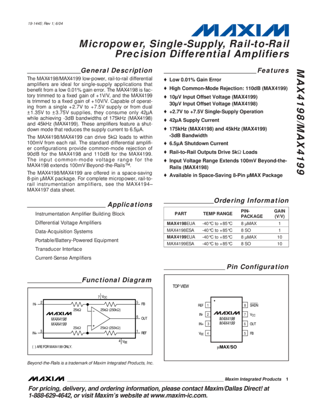 MAX4198, MAX4199 Micropower, Single-Supply, Rail-to-Rail Precision Differential Amplifiers