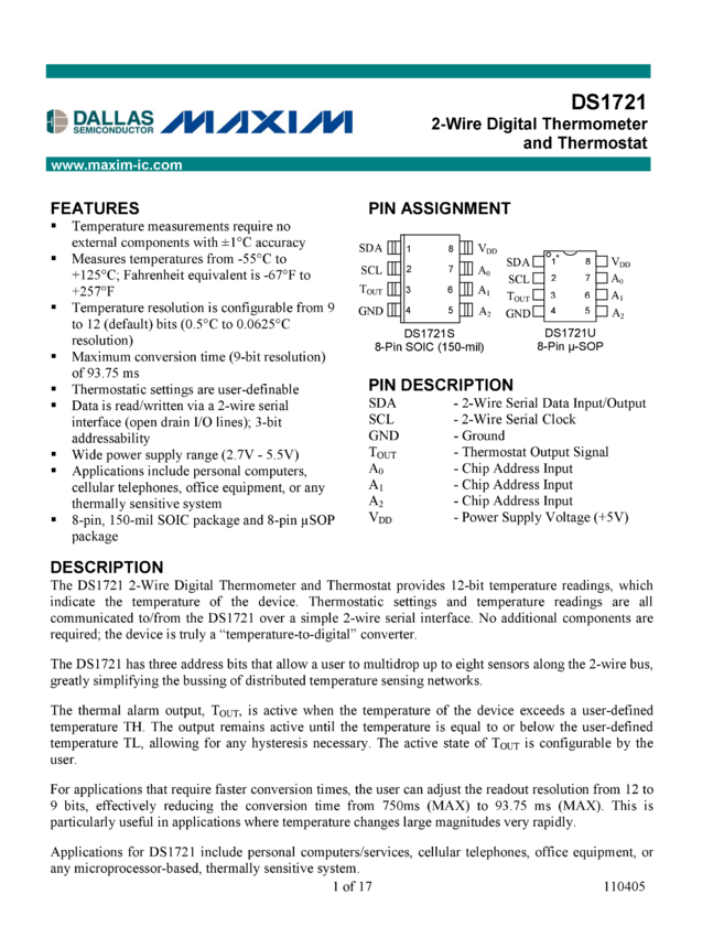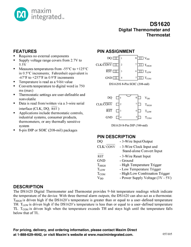 DS1631, DS1631A, DS1731 High-Precision Digital Thermometer and Thermostat
