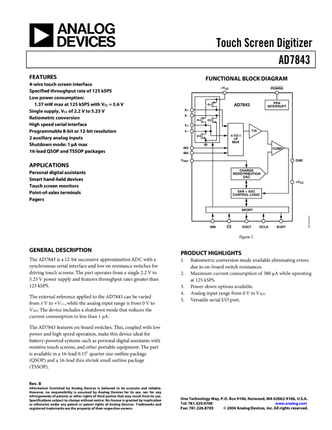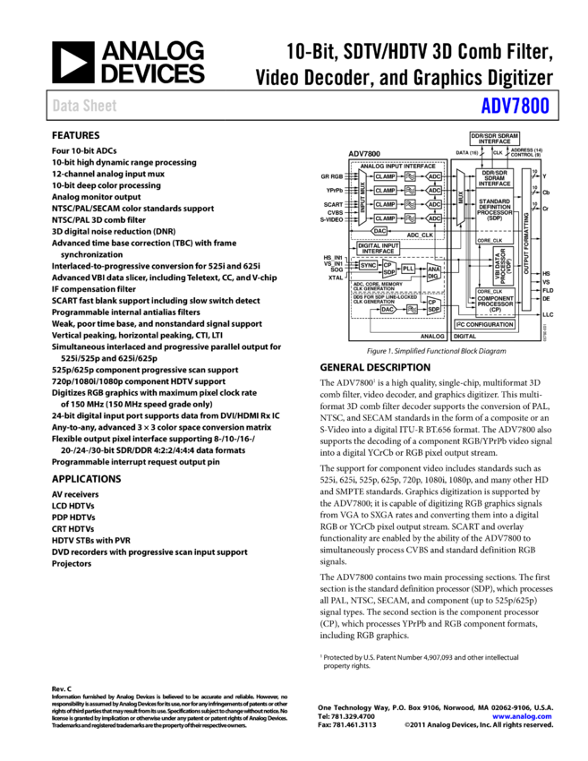 ADV7800: 10-Bit, SDTV/HDTV 3D Comb Filter, Video Decoder, and Graphics Digitizer