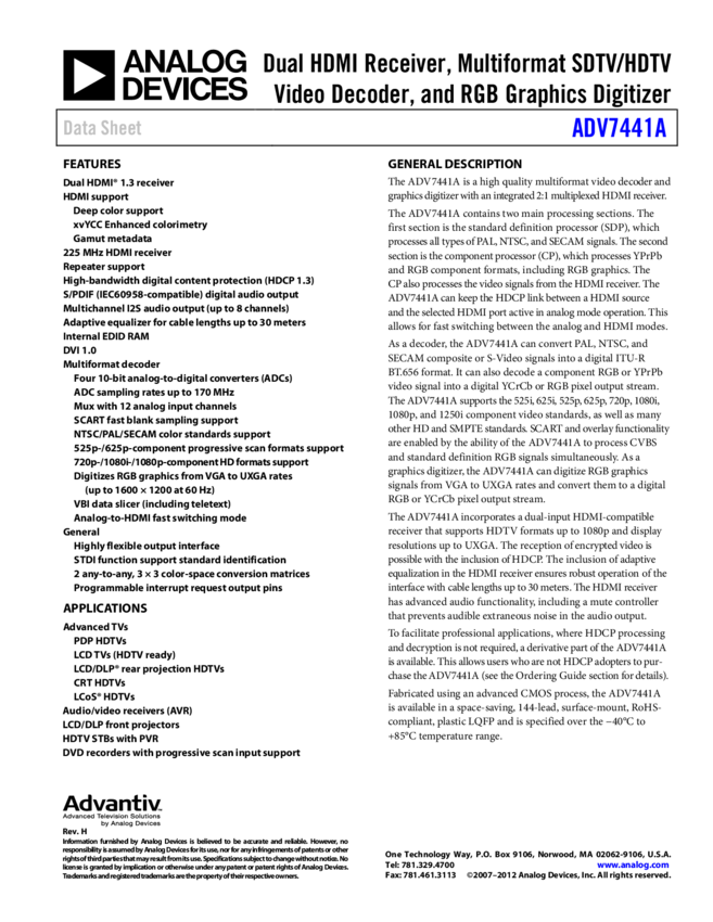 ADV7802: 12-Bit, SDTV/HDTV 3D Comb Filter, Video Decoder, and Graphics Digitizer