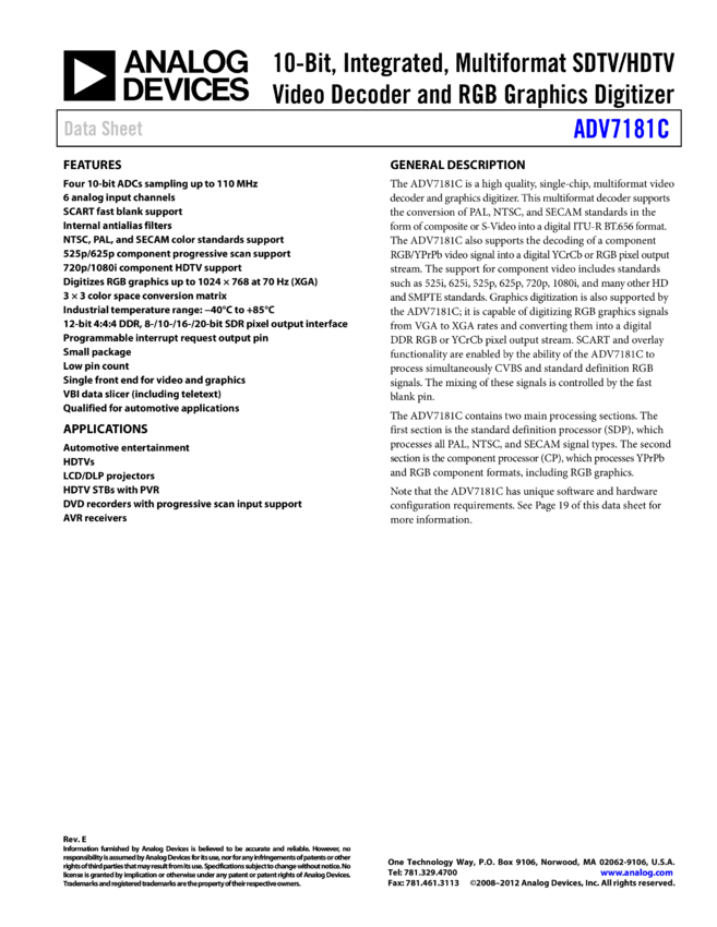 ADV7181C: 10-Bit, Integrated, Multiformat SDTV/HDTV Video Decoder and RGB Graphics Digitizer