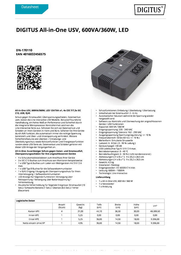 System UPS 600 VA Digitus DN-170110 DN-170110