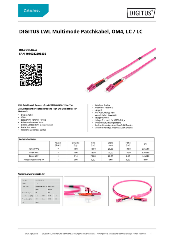 Digitus DK-2533-07-4 światłowodowe do światłowodów kabel 7.00 m fioletowy [1x złącze męskie LC - 1x złącze męskie LC] 50
