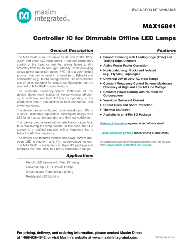 MAX16841 Controller IC for Dimmable Offline LED Lamps
