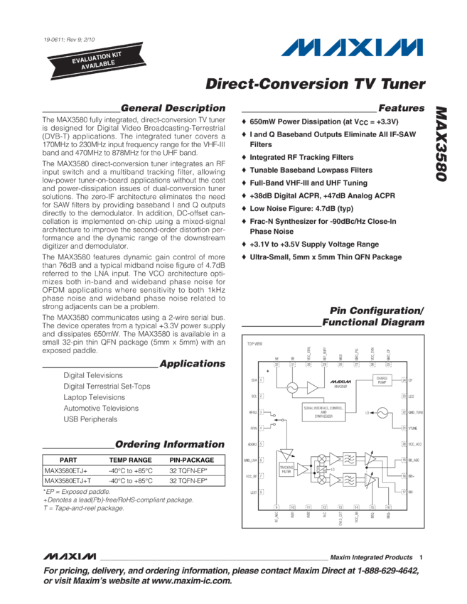 MAX3580 Direct-Conversion TV Tuner