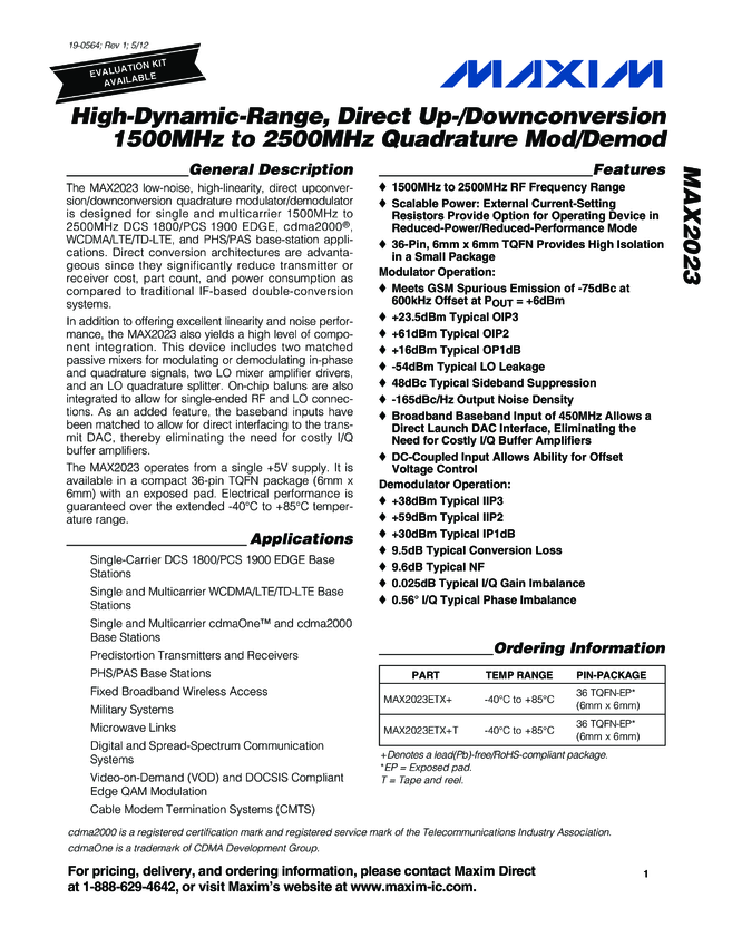 MAX2023 High-Dynamic-Range, Direct Up-/Downconversion 1500MHz to 2500MHz Quadrature Mod/Demod