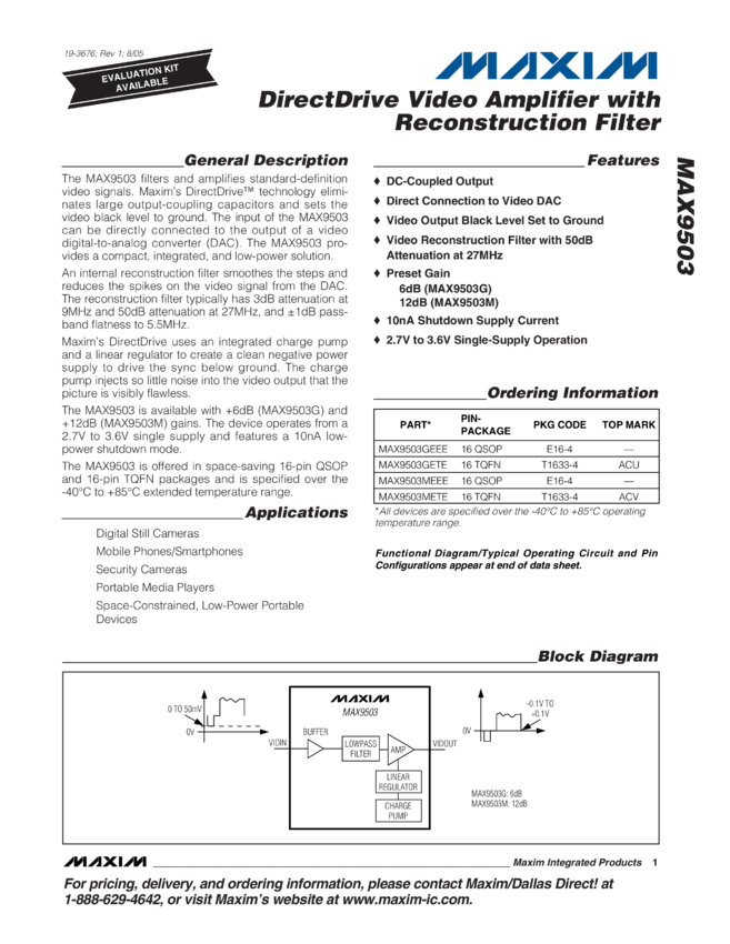 MAX9503 DirectDrive® Video Amplifier with Reconstruction Filter