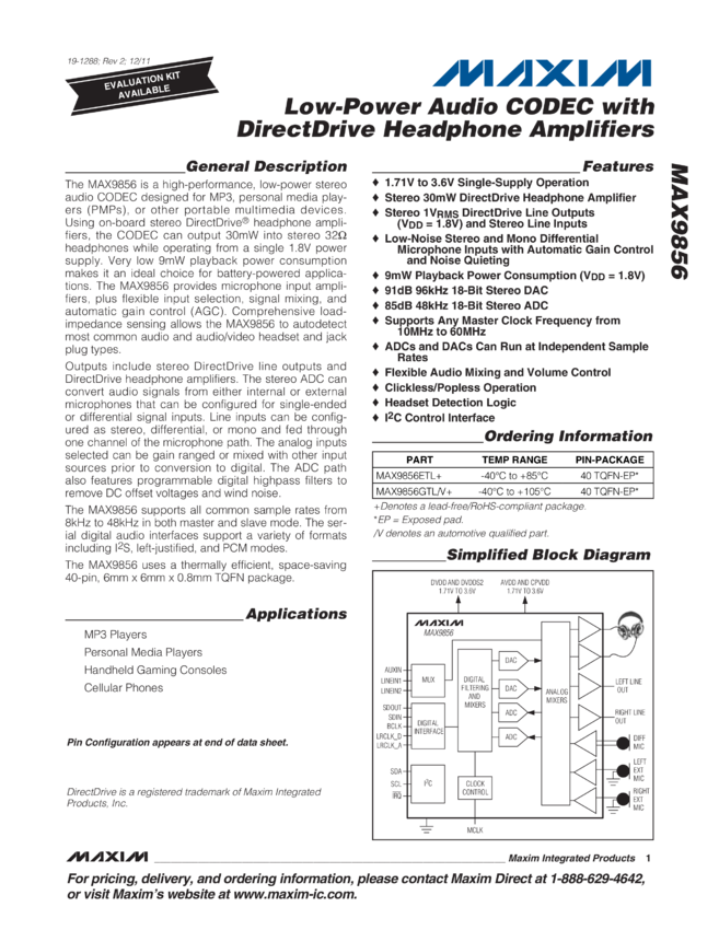 MAX9856 Low-Power Audio CODEC with DirectDrive Headphone Amplifiers