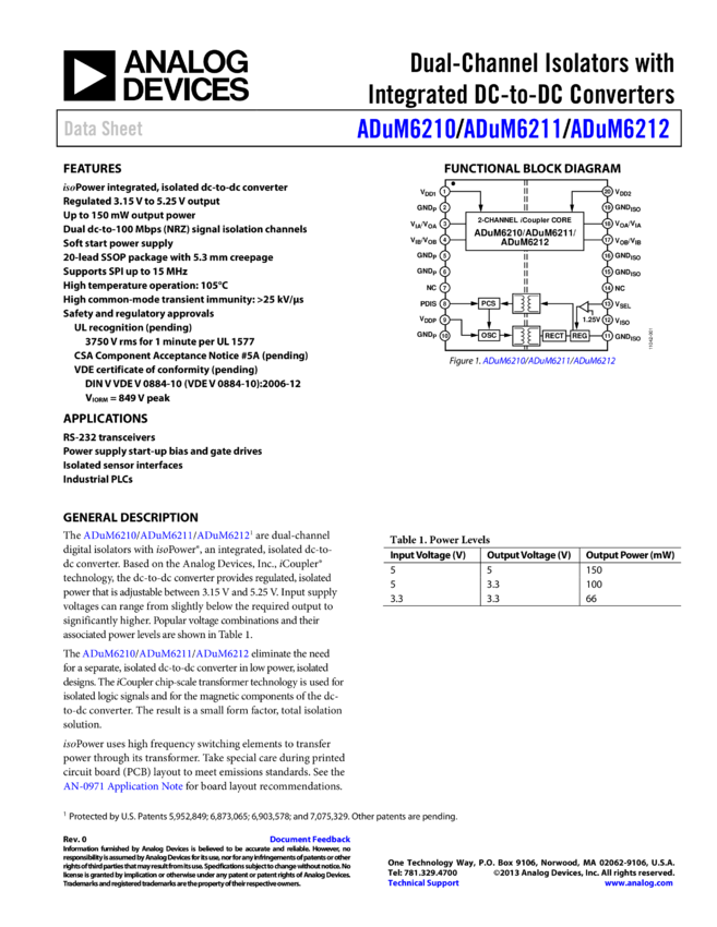 ADUM6211: Dual-Channel Isolators with Integrated DC/DC Converter (1/1 Channel Directionality)